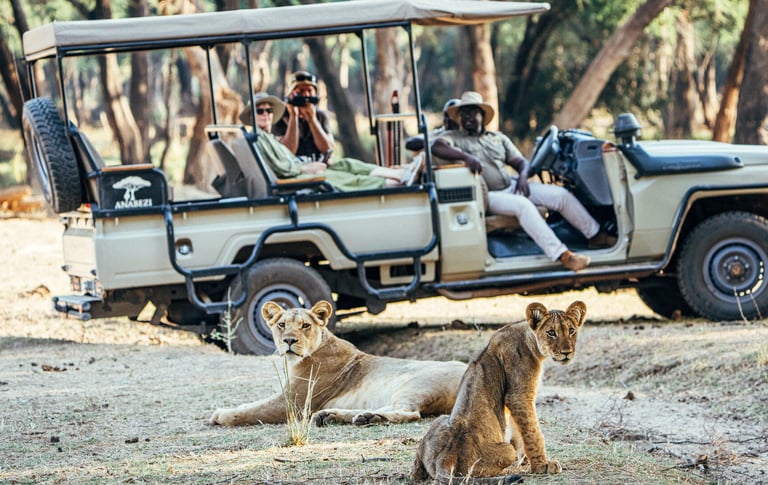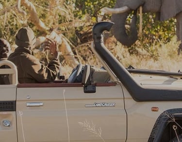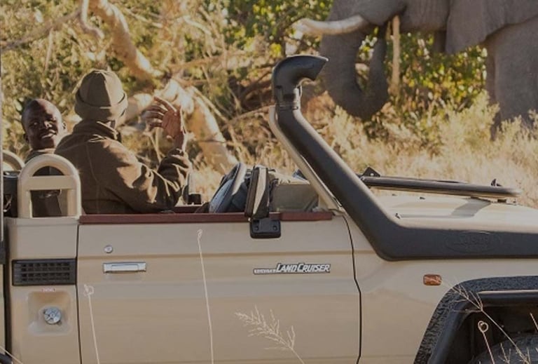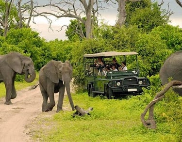 an open-vehicle safari near Victoria Falls, exploring the wild Zambezi National Park for elephants, lions, buffalo, giraffes, and diverse birdlife