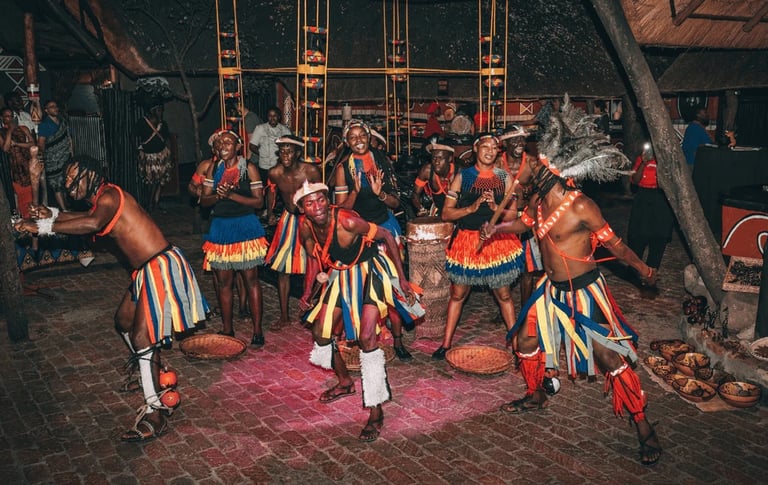 an immersive African safari experience featuring an open-vehicle game drive after sunset to spot nocturnal animals like leopards, lions, and hyenas, using spotlights; followed by a traditional 3-course BBQ dinner under the stars in a boma, with campfire, drinks, and wildlife sounds, offering a magical, sensory adventure far from city lights.